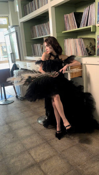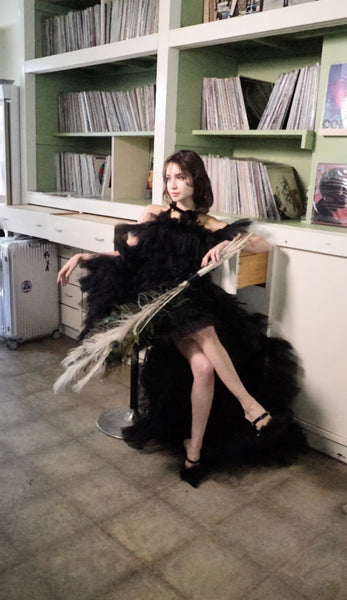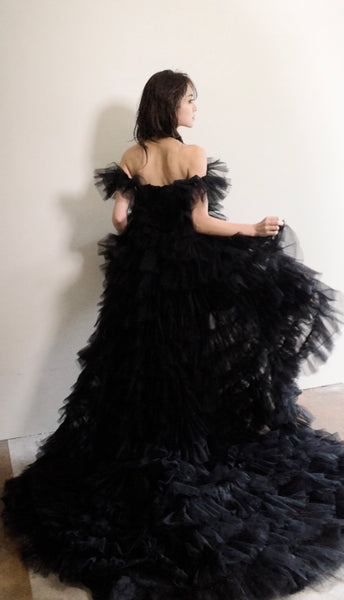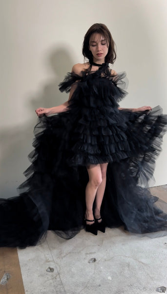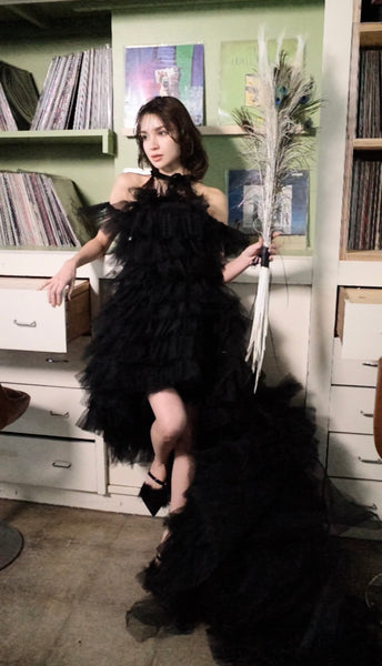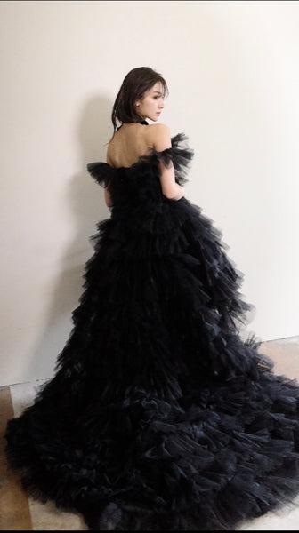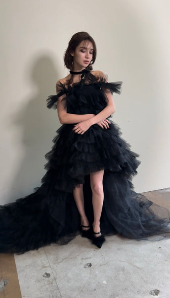 - オフショルダー フリル ブラック ミニドレス(W362)
