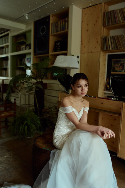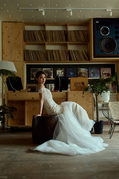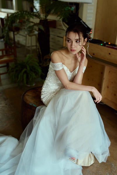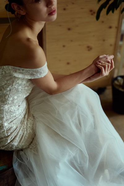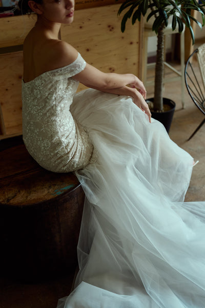 裾はチュールで華やかさがあり、上品かつエレガントなウエディングシーンを