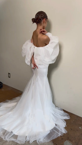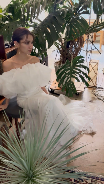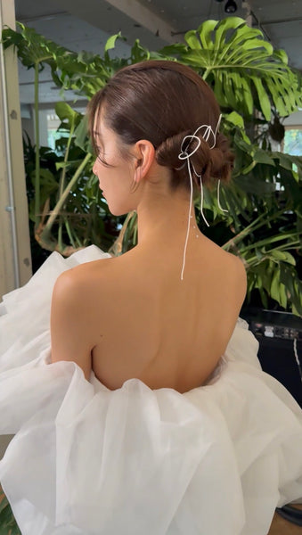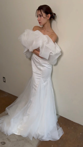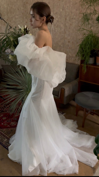 エアリーでボリューミーな袖が華やかで華奢見えさせてくれるドレス。