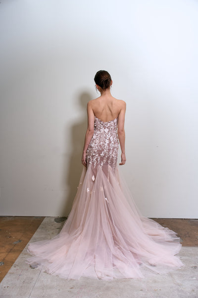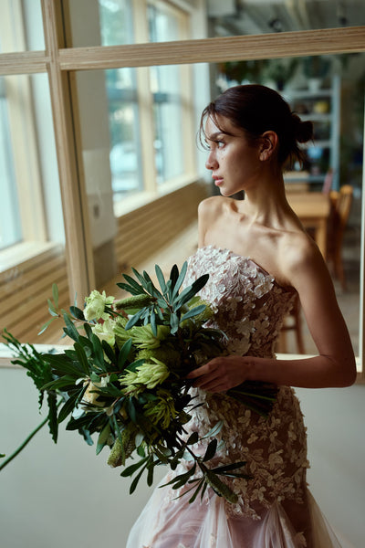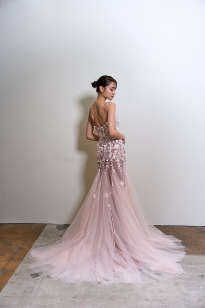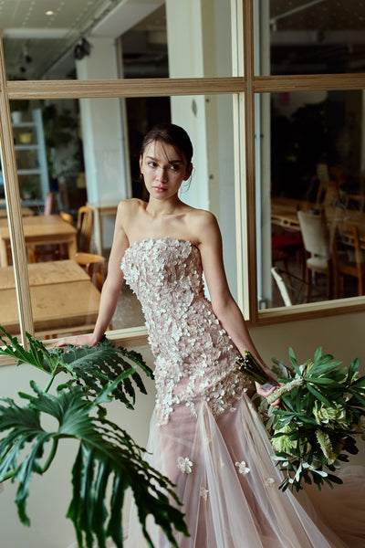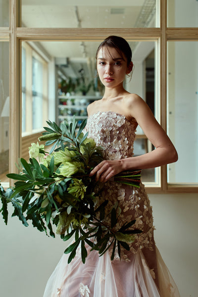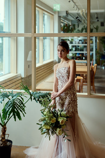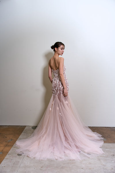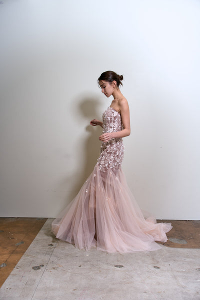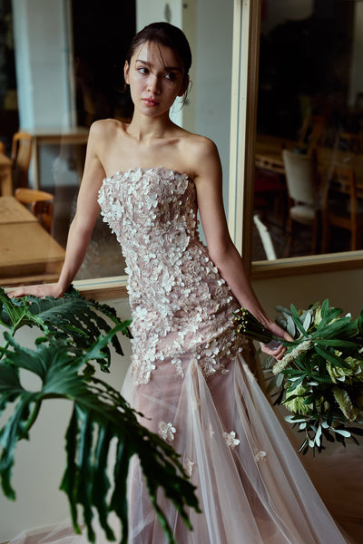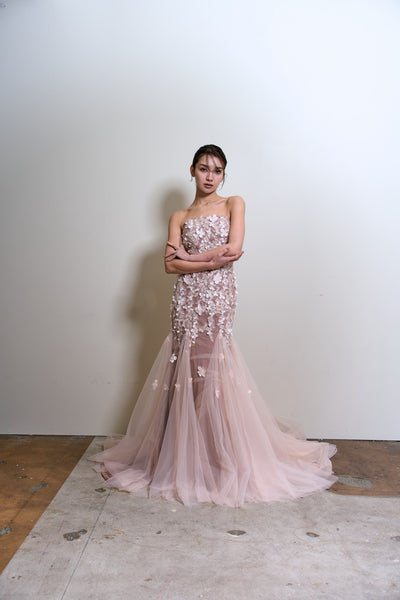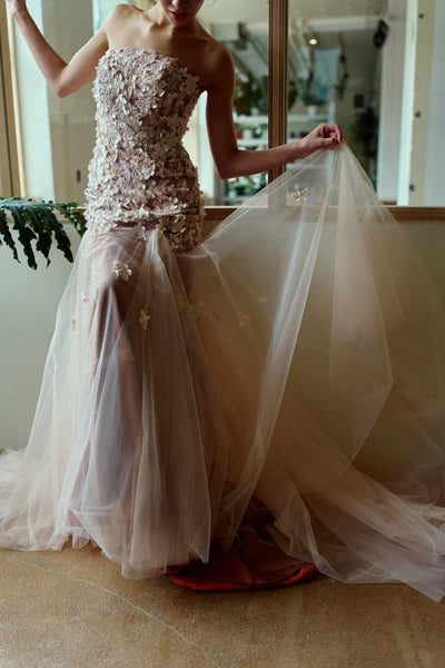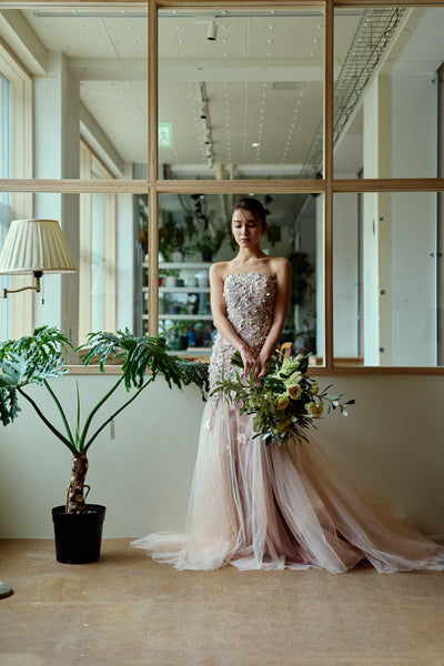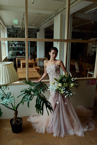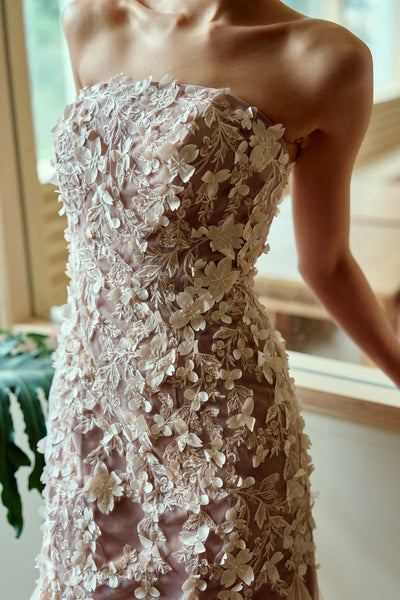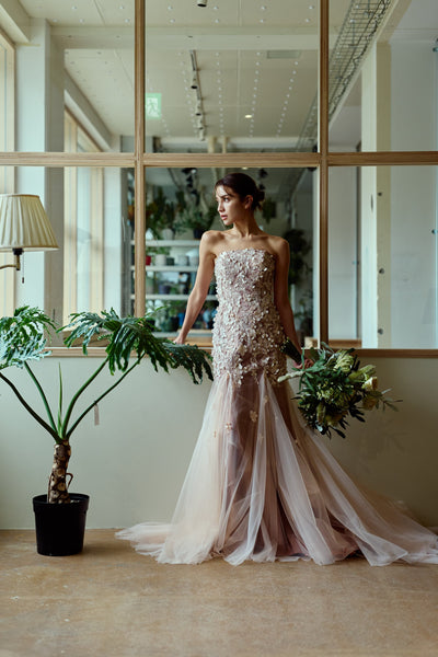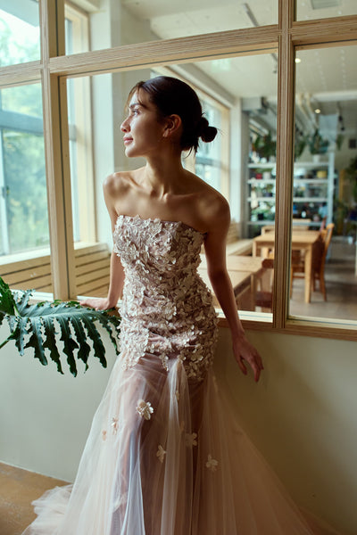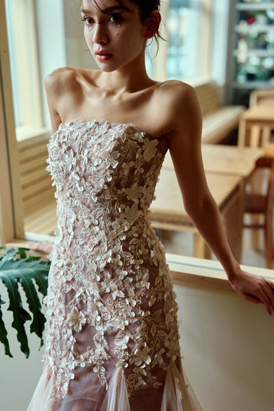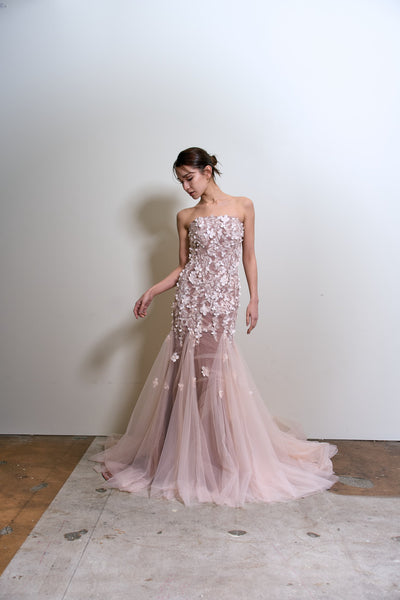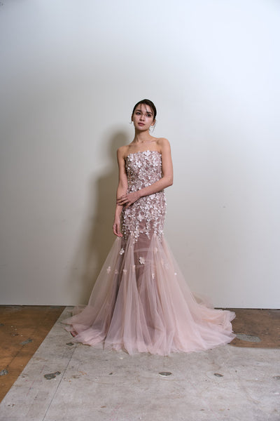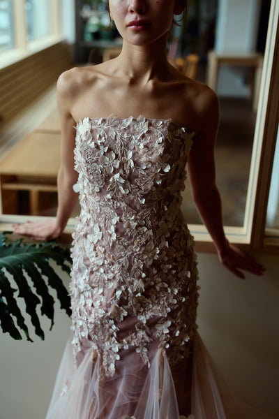 立体的なフラワーレースをたっぷりと施したマーメイドドレス。