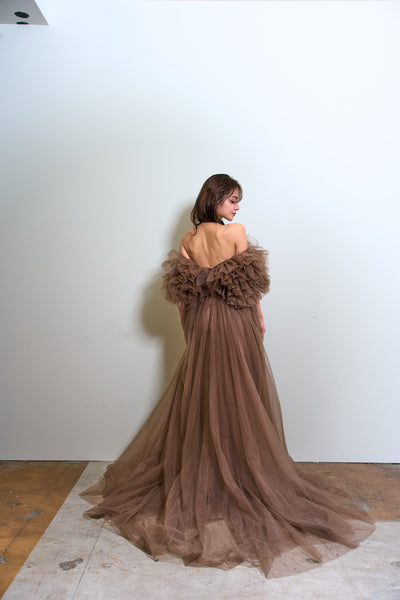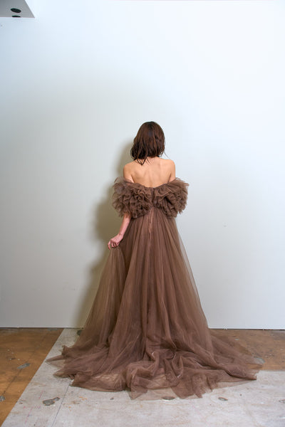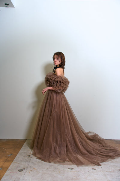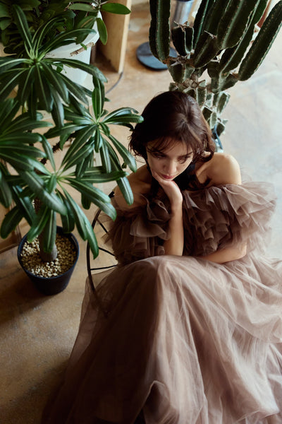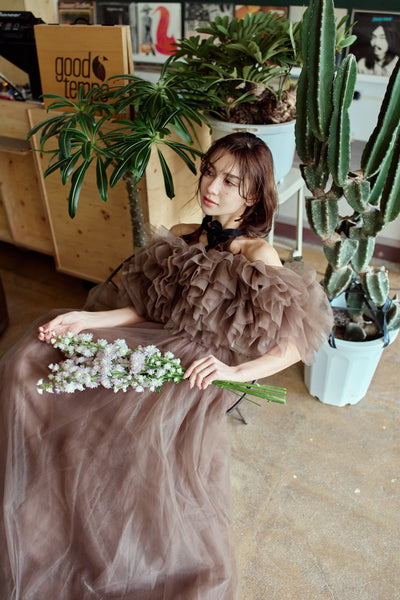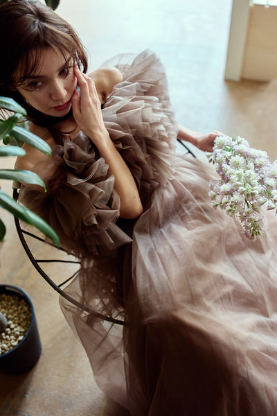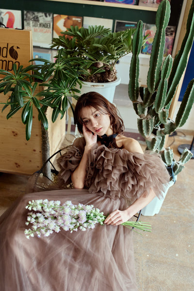 ボリュームのあるフリルショルダーが華やかなドレス。