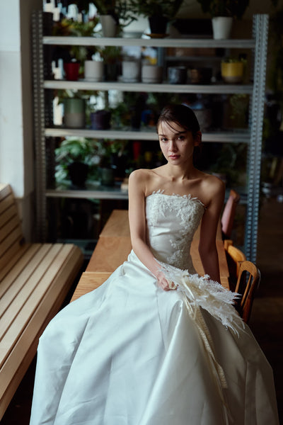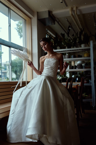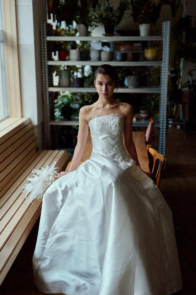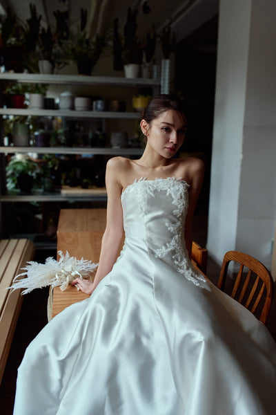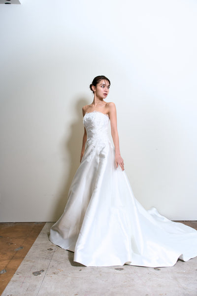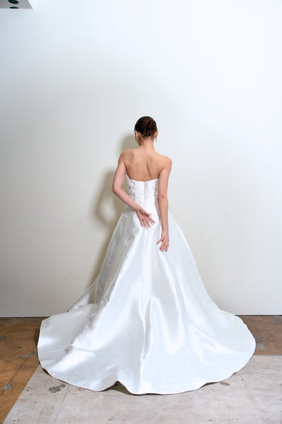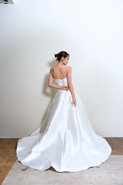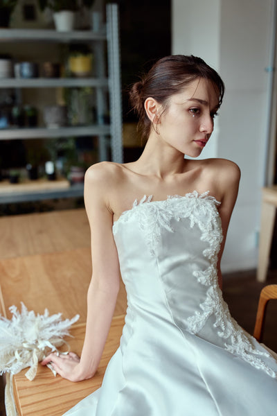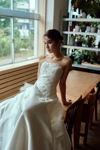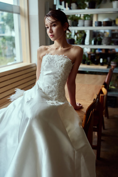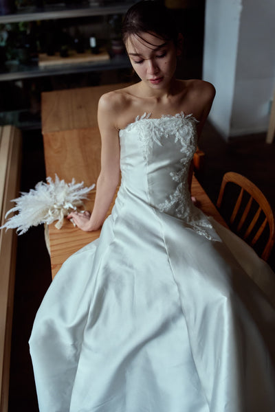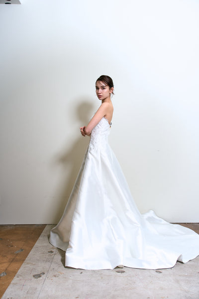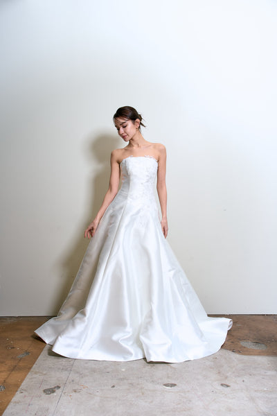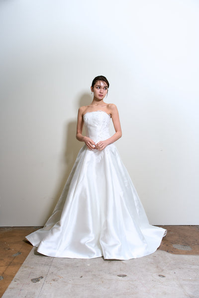 ミカド風の重厚感のあるサテン生地を使用したドレス。